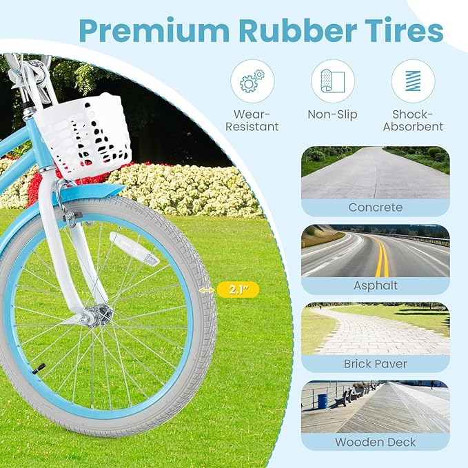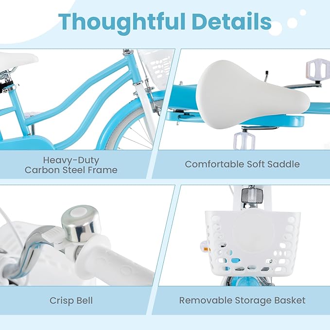 - 【Design for Children】 Featuring an adorable aesthetic and trendy color combination, this bike makes for an ideal birthday or holiday gift for your children. It includes practical elements like a convenient bell, a detachable front basket for storage, a cozy seat, and non-slip pedals for secure grip. Furthermore, the 20” kids bike is equipped with reflectors for improved visibility in low-light situations. The 20” bike boasts a kickstand for effortless parking.
