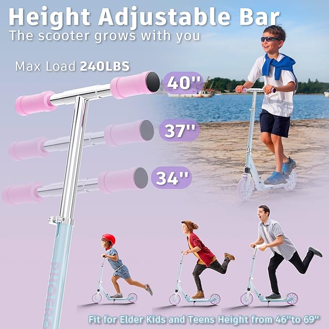 - 【Height Adjustable】PHOEROS Scooter is a scooter that can grow up with you . PHOEROS Kick Scooter Designed Adjustable Height from 34''-37''-40''. Fit for Kids and Teens Height from 46"to 69", all familes can share one scooter together.