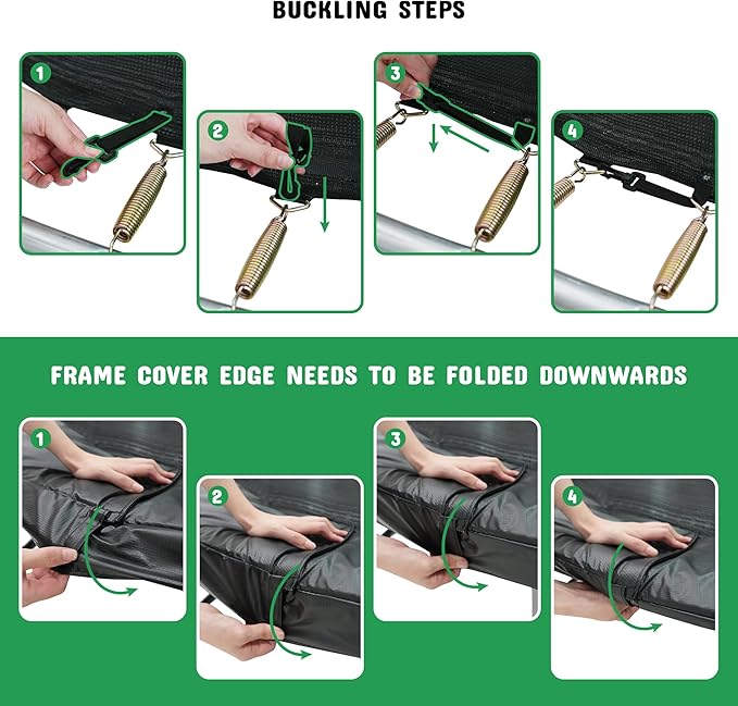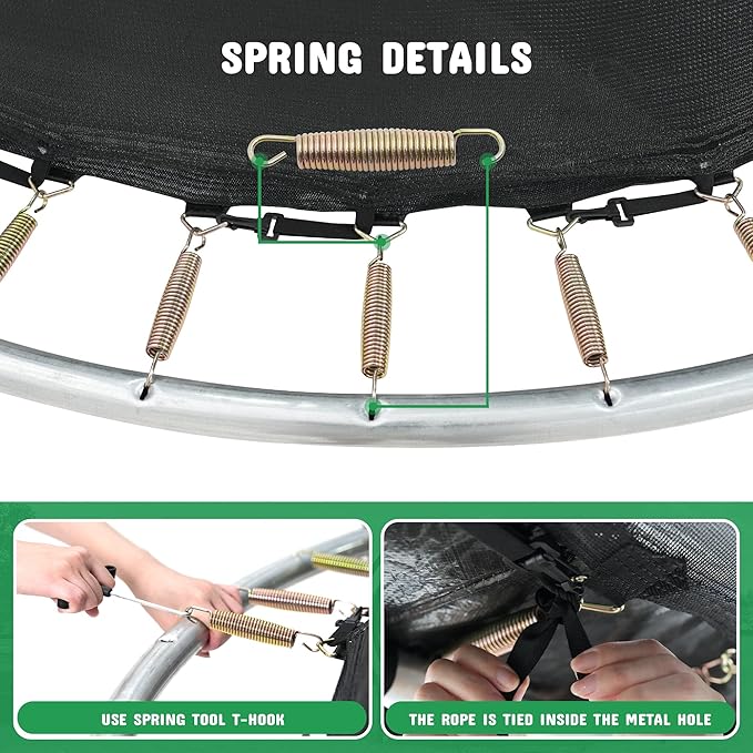 - 【Strong Security】The outdoor trampoline is equipped with a 360 ° safety enclosure net and 8 safety bending bars, which surround and support the entire jumping area in all directions. The gap between the safety bending rod and the safety net, which bring safe and flexible distance. It is prevent children from falling during play. Each safety bending rod is equipped with thickened foam, which eliminates the pain of collision.