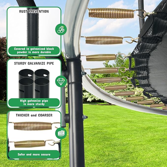 - 【Sturdy and Durable】The overall frame of the trampoline adopts galvanized pipes. Each tube is coated with powder to enhance rust protection and make the trampoline more sturdy and durable.Even in harsh weather conditions, it can ensure durability and long-term use.We have also widened the ladder, it can make it easy to enter and use trampoline for kids and adults.