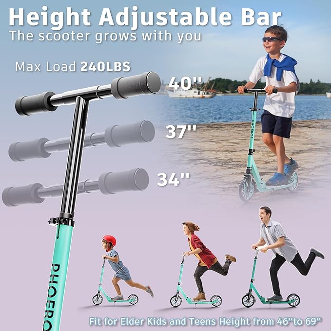 - 【Height Adjustable】PHOEROS Scooter is a scooter that can grow up with you . PHOEROS Kick Scooter Designed Adjustable Height from 34''-37''-40''. Fit for Kids and Teens Height from 46"to 69", all familes can share one scooter together.
