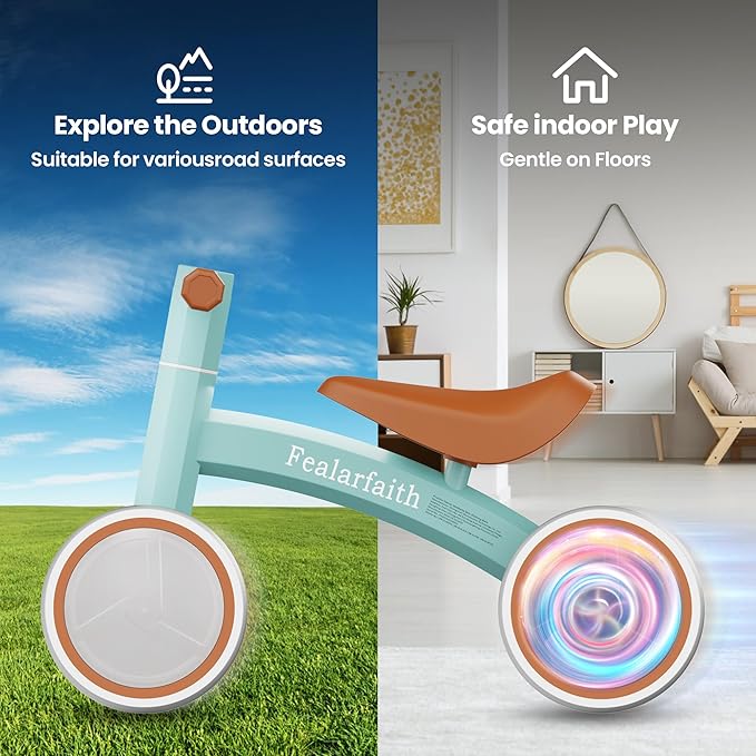 - VIBRANT 4-WHEEL LED LIGHT SHOW: Unlike balance bikes with only 2 lit wheels or none, ours features a full set of 4 colorful spinning wheels that require no batteries! They magically light up with movement, creating an exciting and captivating ride. This unique design makes it the perfect toddler bike for fun indoors and outdoors, day or night.