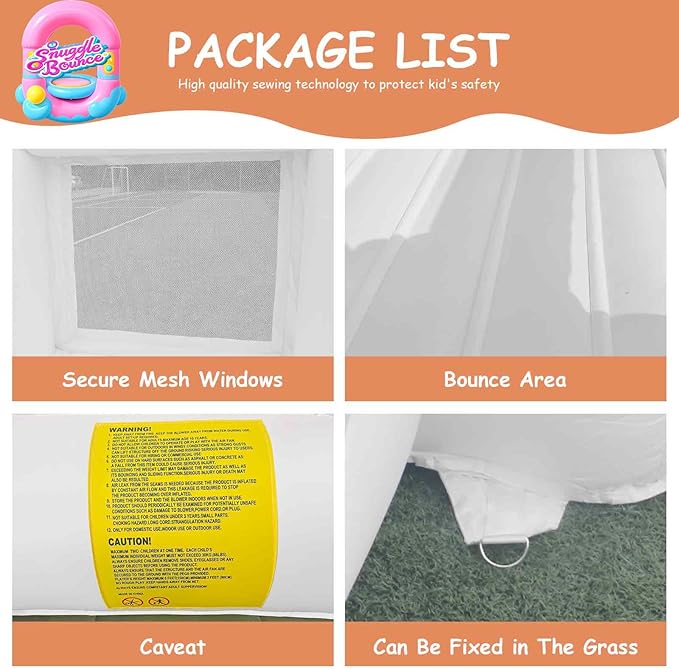 - 【 Packing List 】 White Bounce House x1. Blower x1. Floor mat x1. Mini basketball x2. Storage bag x1. Decorative balloons x1 (100 pieces). Fixed wooden stake x6. Repair kit x1. Instruction manual x1. Balloon pump x1. (This set of product accessories does not include the ocean ball in the picture, the picture is for reference only, and the detailed information of the accessories is subject to the packing list.)