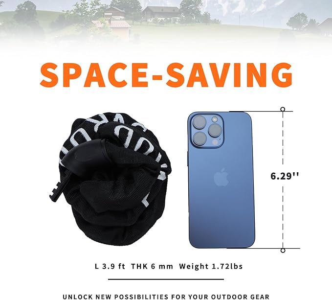 - One Lock, Endless Uses:Flexible bike chain lock easily wraps around thick trees, benches & wide rails.Park worry-free anywhere, even in unfamiliar spots.works on bikes, e-scooters, lawn gear, BBQs, ladders & gates