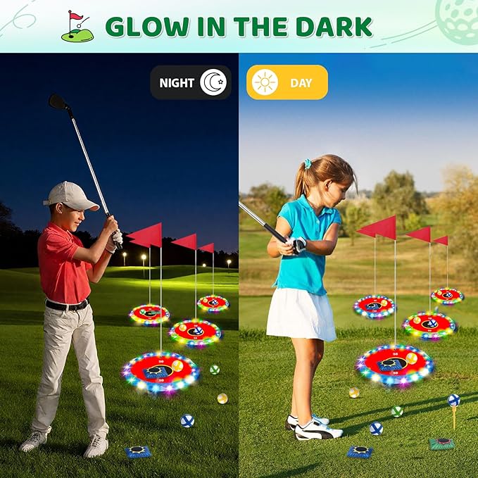 - 【UPGRADED GOLF GAMEPLAY, DOUBLE THE FUN】Experience our new upgraded glow-in-the-dark golf gameplay, combining the challenge of golf throwing with classic bean bag throwing! This creates an exciting experience for golf enthusiasts of all skill levels. Equipped with 6 portable glowing targets, it can be placed anywhere instantly, whether indoors or outdoors, it can shine brightly. Whether you plan a backyard party, a beach vacation or a family gathering, it can become the focus of any event and is your ideal outdoor golf game