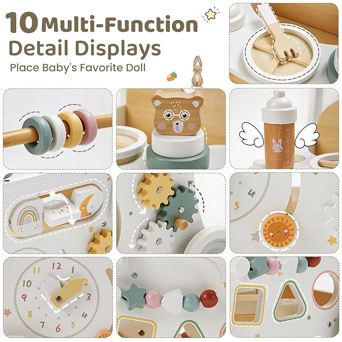 - Funny Activity Center Play: This push and pull walker comes with countless fun activities for your toddler to play with, word flipper, spinning gear, sun buttons, clock, shape sorter, tracing game, dinner plate, fork, bottle, bear stacking game. Designed with a vibrant theme.