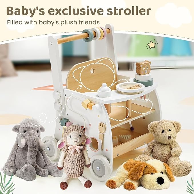 - Unlimited Possibilities: A standing baby walker good for exercising baby's motorskills, balance and fine motor skills, is a better choice to help babies practice standing on their own compared to a seated walker. From word flips to bottle, the doll stroller walker guarantees endless entertainment. It is not just a toy, but a gateway to unlimited imagination and growth, and a trustworthy vacation partner.