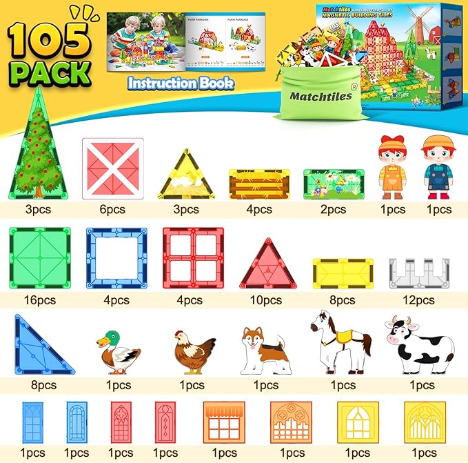 - Magnetic Tiles Animals Set: 105PCS Magnetic Building Blocks Set features realistic 5 animals and 2 farmers, adorned with rich patterns and vibrant colors, which add creativity and unique elements to your child's playtime. The unlimited connectivity of magnetic tiles offers endless possibilities for open-ended play, ensuring hours of engaging building time. Kids can build a farm houses for farmer and animals to living in the farm.