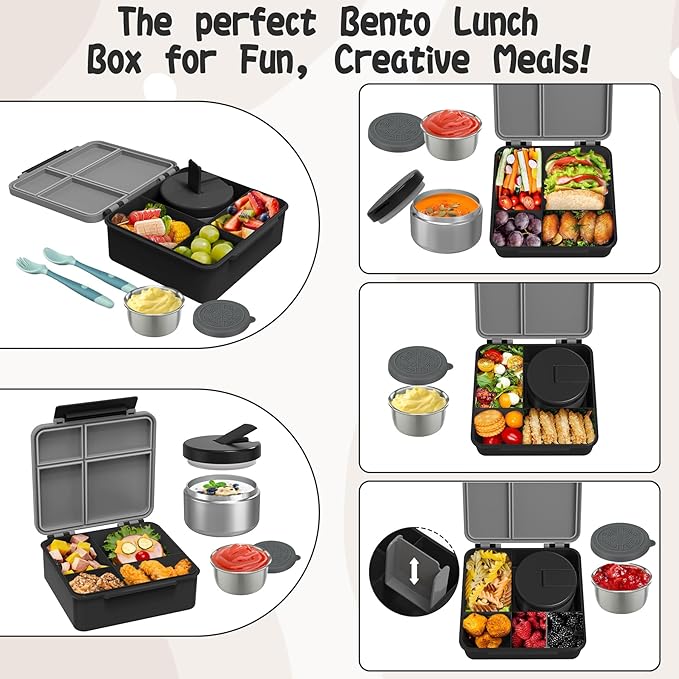 - 🥑Bento Lunch Box Set for School:This bento box set contains: 1* lunch box, 1*insulated lunch bag, 1*8oz soup thermo, 1*salad dressing container, 1*food divider (change 4or5 compartment) and a set of cutlery (spoon and fork). lunch box container adopts a single lock buckle design, making it easier for children to open, and the 8OZ vacuum insulated soup thermo also adopts a latch design, so there is no need to worry about your child not being able to open it.