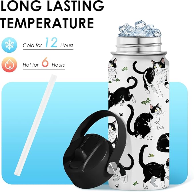 - 🐱 Premium 304 Stainless Steel - Safe & Durable! Made of high-quality 18/8 (304) food-grade stainless steel, this non-toxic and BPA-free water bottle features double-wall vacuum insulation to keep drinks cold for 12 hours and hot for 6 hours. Rust-proof and odor-resistant for long-lasting durability