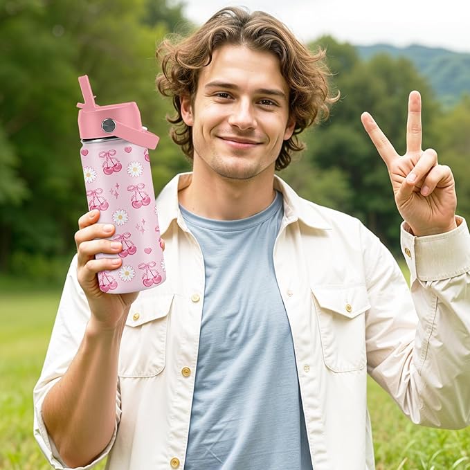 Cherry Gifts for Kids - 16oz Pink Kids Water Bottle with Straw Lid, Stainless Steel Insulated Tumbler, Leakproof, BPA-Free, for Girls, School, Travel - Cherry Lovers Children Birthday Gift Cup (1pc)