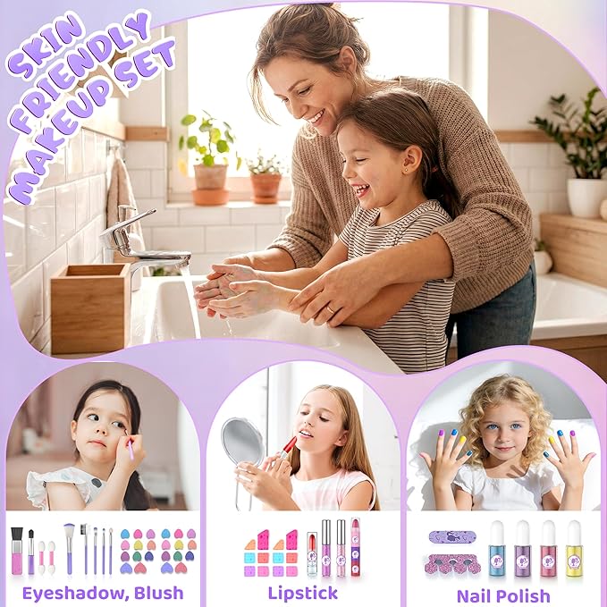 - 💧【Safety and Washable】We always put safety first. All products in the non-toxic girls makeup kit age 4-6 have passed the international toy safety certification, and adopt skin-friendly and washable formulas, which are gentle and non-allergenic. Just rinse with water and it will be clean. Mom can rest assured and the baby will be happy, allowing children to play without any worries