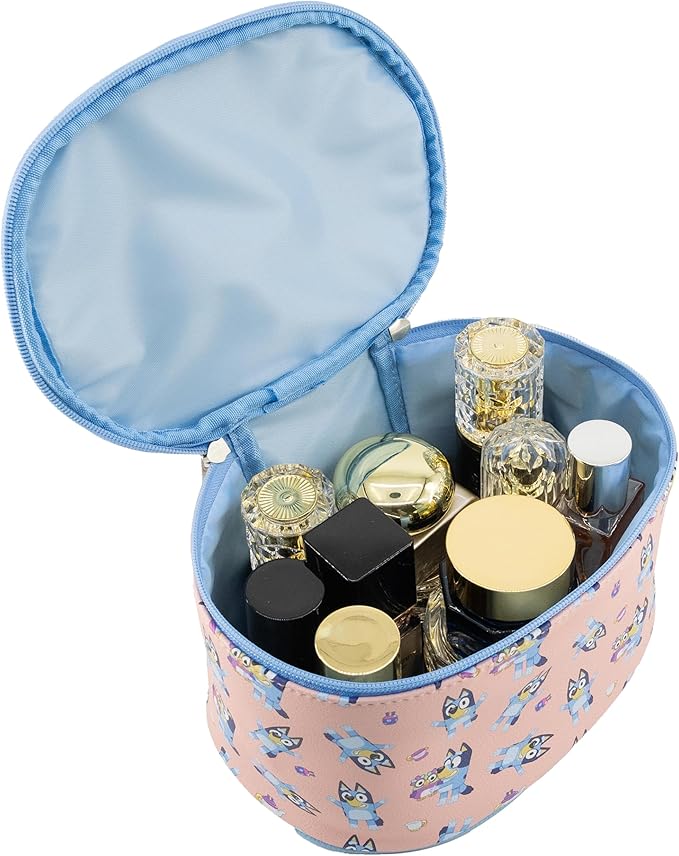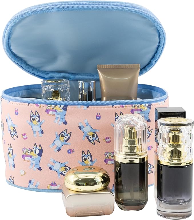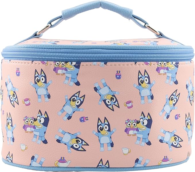 - OFFICIALLY LICENSED BLUEY MAKEUP BAG: This officially licensed Bluey makeup bag features an all-over print of Bluey with toys and teacups. The soft PU leather Train Case includes a stitched handle and silver zipper pull. Great for kids makeup, travel, or everyday storage, it’s a cute makeup bag for girls, teens, or adults who love Bluey. Recommended for ages 3 and up.