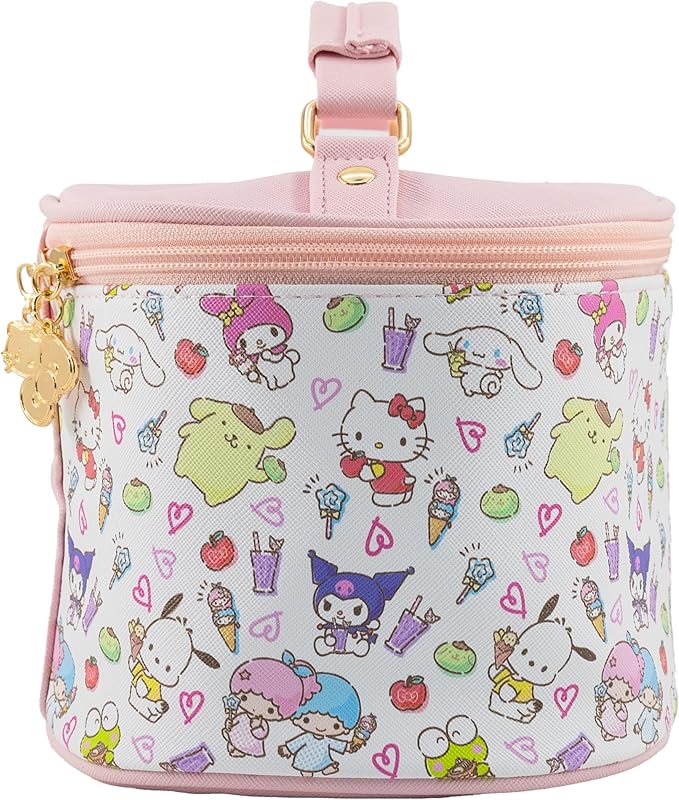 - OFFICIALLY LICENSED SANRIO HELLO KITTY MAKEUP BAG: This officially licensed Hello Kitty makeup bag features Hello Kitty, Kuromi, My Melody, and more Sanrio friends in a colorful all-over print. With a zippered top, Saffiano finish, and sturdy handle, this makeup bag is perfect for travel, storage, or everyday glam. A must-have for Hello Kitty fans who love cute accessories and collectible cosmetic bags.