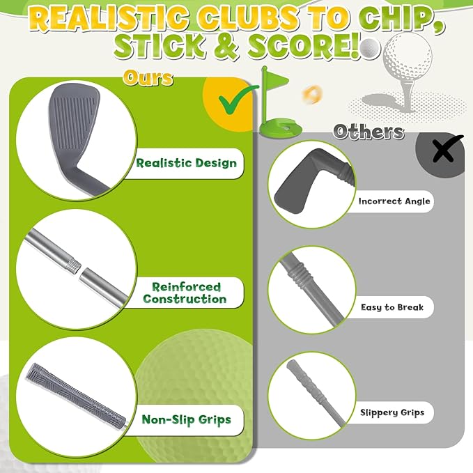 - Realistic Clubs, Enhanced Play: This golf game features three authentic club heads (wood, iron, and putter) with professionally balanced length, weight, and angles. Crafted with premium materials, the clubs combine high-grade aluminum shafts with durable ABS polymer heads, ensuring lasting durability and impact resistance, helping kids develop proper swing skills with comfortable grips