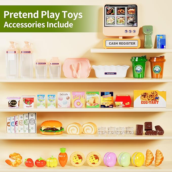- 5-in-1 Grocery Store Pretend Playset: It has a toy cash register, a hand-held scanner, kids coffee maker, ice cube bin and food display cabinet. The set also includes play food set, plastic ice cubes, toy kitchen accessories, credit card, pretend money and boxed goods. Any parent will know that little ones always want to get involved in grocery shopping, and this deluxe supermarket toy will give them the opportunity to run their very own store.