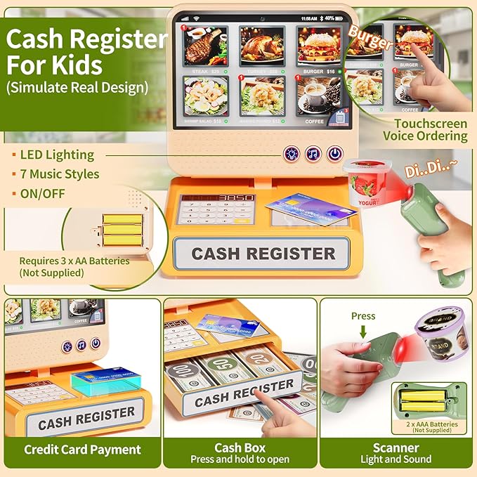 - Simulate Real Design: This upgraded kids cash register with touchscreen ordering and music function. Simply touch the menu on the screen, and the name of the food item will play immediately. It also features a scanner that simulates real lights and sound effects. Kids can ring up hours of fun on this little device that is perfectly sized for little hands and big imaginations.