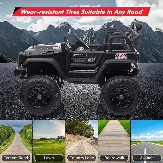 - Real TWO Seats -- Overall size: 47.6"*33"*32.3"(L x W x H). Seat Width: 19.7". Max Load:50KG(110LB). The car can easily load 2 kids(under 4 years) or one 4-8 years child to drive. 2 seats with 2 single safety belt.