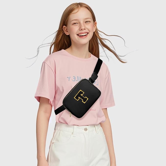Birthday Gifts for 8 9 10 11 12 13 14 Year Old Girls, Personalized Crossbody Bags Fanny Pack with Initial Letter Patch, Mini Belt Bag for Teen Girls Cute Trendy Stuff Travel Essentials (Black,T)