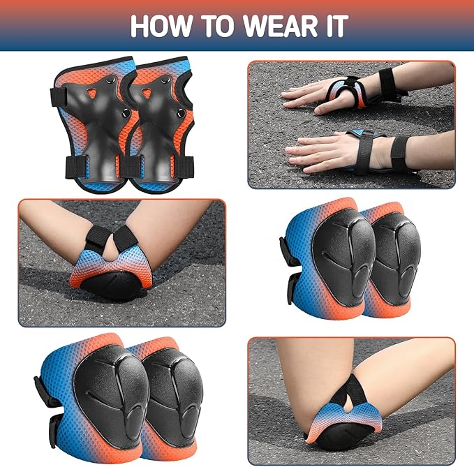 - 【HIGH-QUALITY PROTECTION】The toddler skateboard helmet set made of a sturdy PC shell and high-density shock-absorbing EPS foam. There are 8 vents on the top to keep your child's head cool and comfortable. The outer shell of the knee pads and elbow pads is made of PE material and filled with soft EVA foam to effectively cushion the impact.