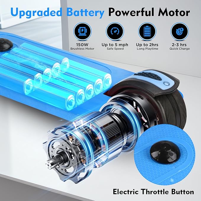 - Powerful Ride with Extended Playtime – Equipped with an upgraded battery and high-performance motor, this electric scooter for kids offers up to 2 hours of nonstop fun at speeds up to 5 MPH. Simply step on the acceleration button on the deck and kick for 2 seconds to activate electric mode — enjoy a smooth, safe, and exciting ride every time!