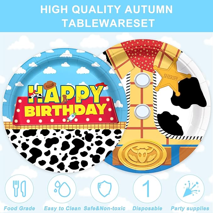 182PCS Toy Theme Party Supplies Cartoon Toy Theme Party Decorations Toy Theme Tableware Set Plates Napkins Cups Banners Tablecloths Forks Knives Holds 20 Guests