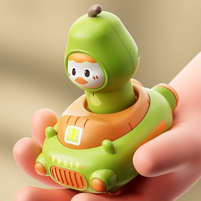 - Simple Play, Endless Fun - Press and Go. Just press down and watch the cars zoom forward! No batteries required. Cartoon vegetable and fruit-shaped vehicles add extra fun and keep young children engaged.