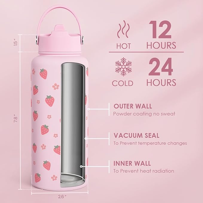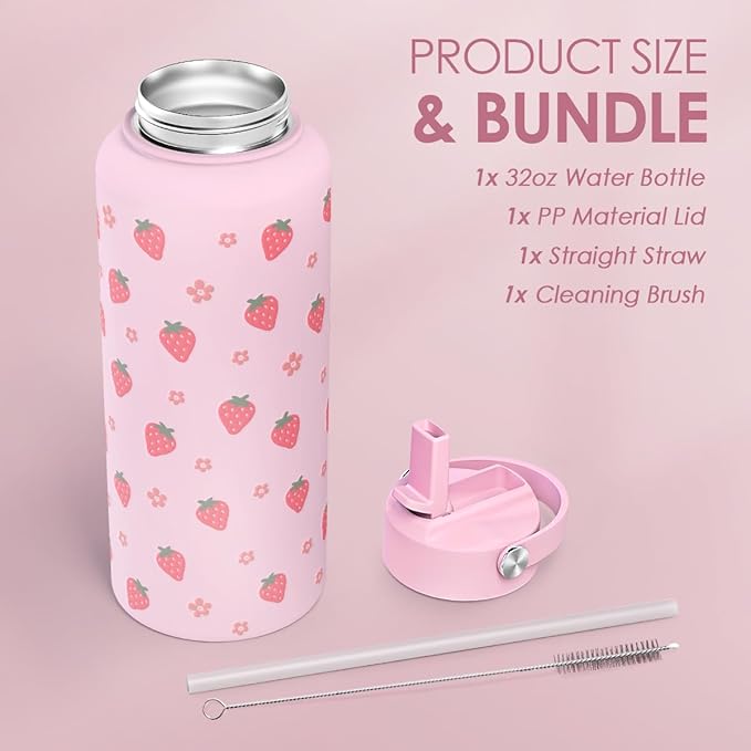 Strawberry Water Bottle 32oz Stainless Steel with Lid & Straw, Insulated Bottles for Women Girls, Gifts Ideas for Birthday Christmas
