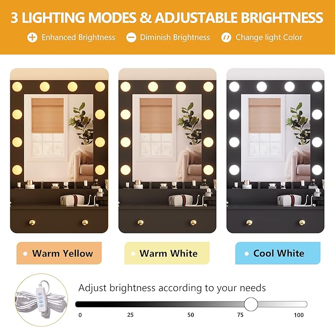 - 【Lighted Vanity Desk with Mirror – 3-Color Dimmable LED Lights】This 43" makeup vanity features a lighted mirror with 10 bulbs offering warm, natural, and cool lighting. Easily adjust brightness to create the perfect setting for makeup, skincare, or video calls.