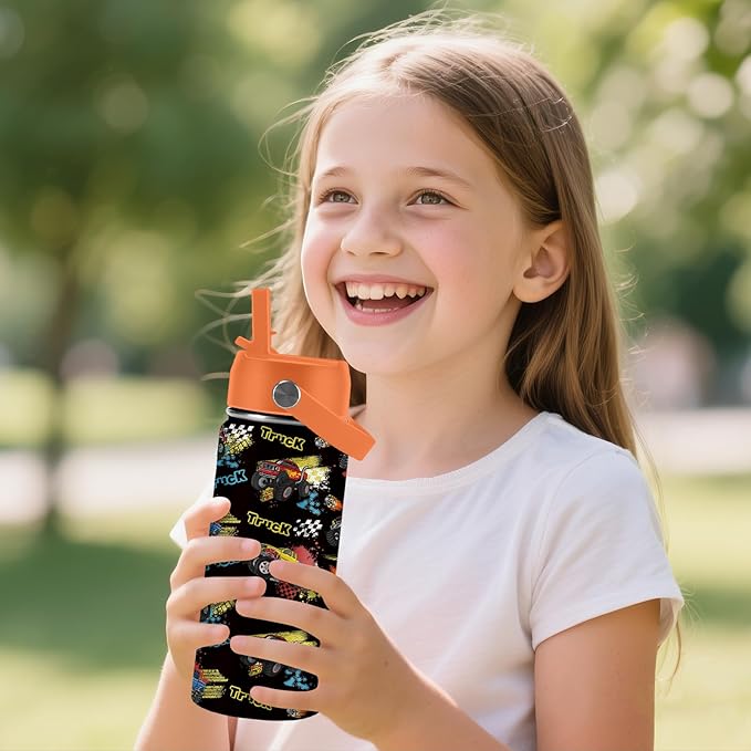 Truck Gifts for Kids - 16 Oz Kids Water Bottle with Straw Lid, Stainless Steel Insulated Tumbler, Leak Proof, BPA-Free, for Girls, School, Travel - Truck Lovers Children Birthday Gifts Cups(1pc)