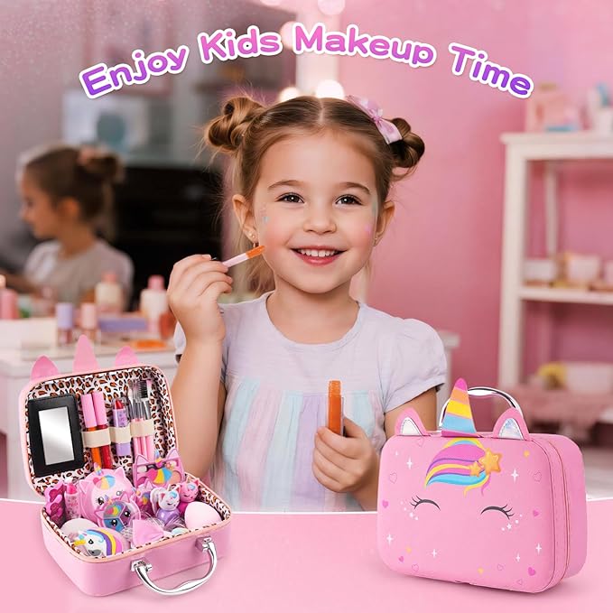 - 【Exquisite Children's Makeup Case】Our kids makeup comes with an exquisite makeup case. The cute large-capacity design allows your little girl to carry all her makeup toys together, making it convenient to carry. Your princess can play with her favorite children's makeup toys at Christmas, makeup parties and other places. The makeup kit for girls 10-12 satisfies little girls' curiosity about makeup
