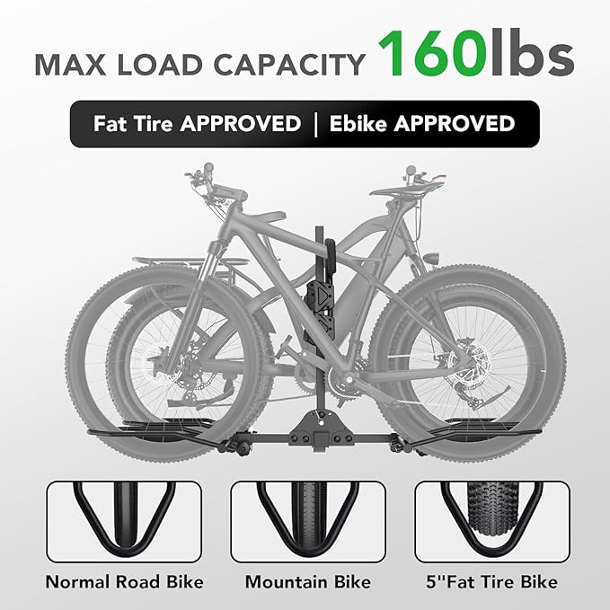 - Durable Construction: Constructed with high-strength materials to support a total load of up to 160 lbs. Compatible with tires up to 5 inches wide, suitable for e-bikes and fat tire bikes.