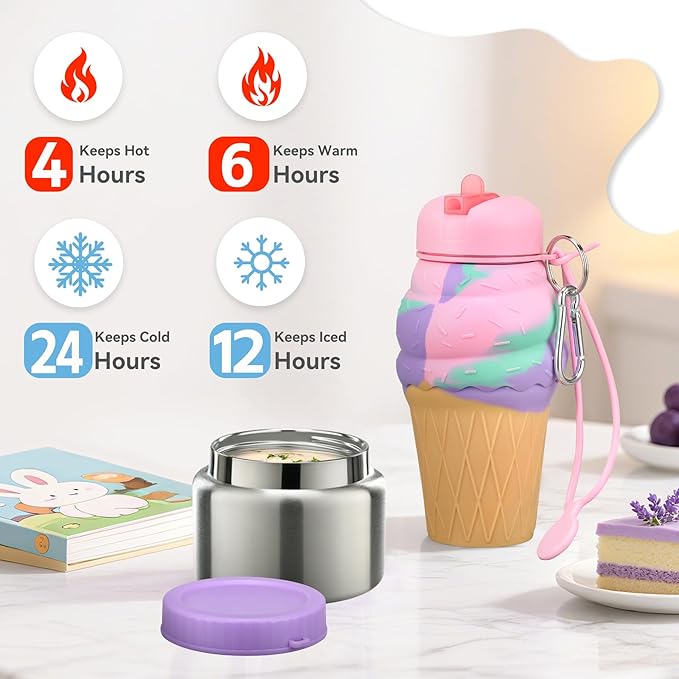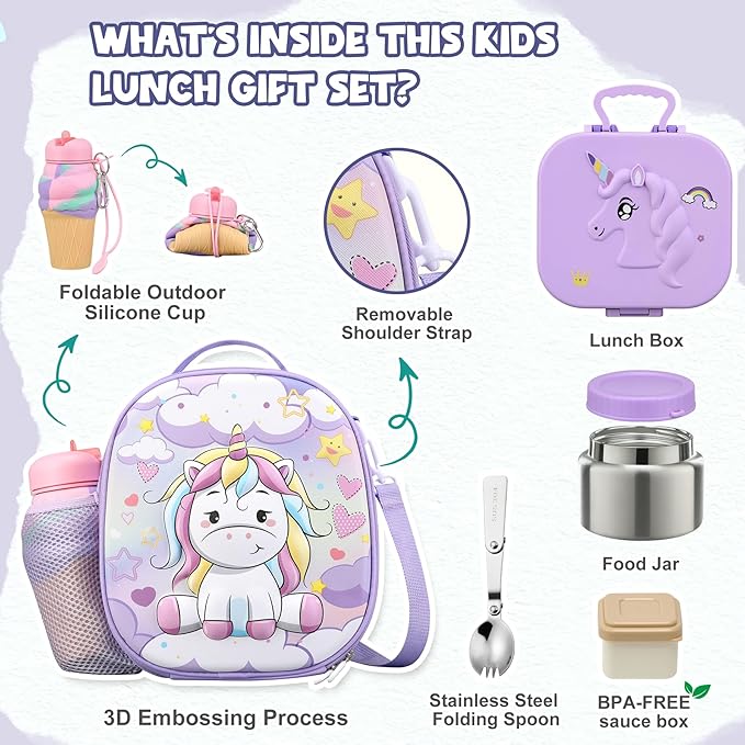 - 🌈Kids Friendly Design: Our perfect lunch box set allows you to fill your child with all the necessary food, bread, fruits, vegetables, hot soup, and more, allowing kids to have a balanced diet, the insulated bag is equipped with a handle and shoulder strap, making it more convenient for children to carry.