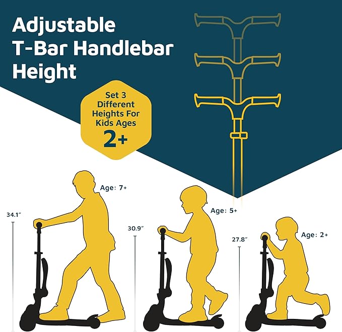 - GROWS WITH YOUR CHILD - The adjustable T-bar handlebar offers three height settings (27.87", 31", and 34.1") to keep up with your growing rider. Designed for ages 2 and up, this kids scooter evolves with your child for years of scooting adventures.