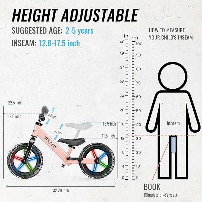 - STURDY AND SAFE- What you think for your kids is what SEREED toddler balance bike have. Wide and tough carbon steel frame, supports up to 110 lbs, safe footrest pad, rubber grips, soft saddle and a 11.8 inch starting seat height, let your little one enjoy cycling at an early age!