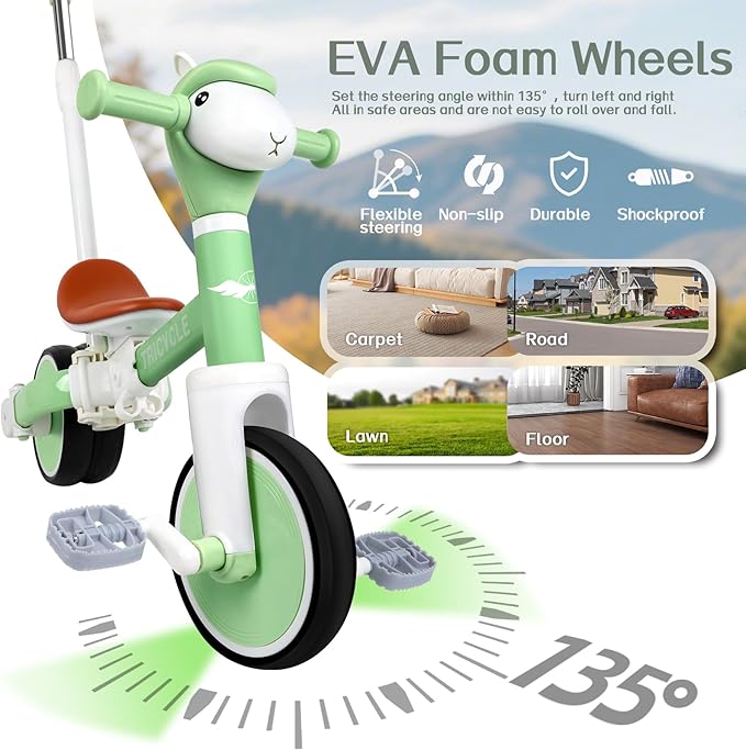 - 🛡360°Safety Assurance : 135°steering limit prevents rollovers; enclosed wheels block feet. Features anti-slip grips, speed-control steering, and non-toxic materials. Shock-absorbing EVA tires grip indoor floors or outdoor terrain safely.