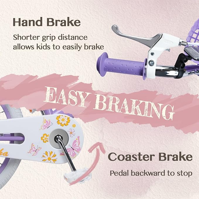 - 【EASY BRAKING】Equipped with easy coaster brakes and front hand brakes, this kids bike ensures an intuitive braking experience to help your child confidently master important riding skills.