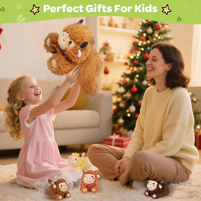 - Five Cute Highland Cows: Pull open the zipper on the belly of the highland cow mommy, and you will be amazed! Four adorable cow babies are waiting for you to discover. Children love the colors of the cow babies. They have bright eyes, soft bodies, and cute expressions. Meet the gentle Highland cow and her sweet calves! Your kids will love them and can't wait to cuddle them. Our toy is perfect for girls aged 0, 1, 2, 3, 4, 5, 6, 7, 8 years old.