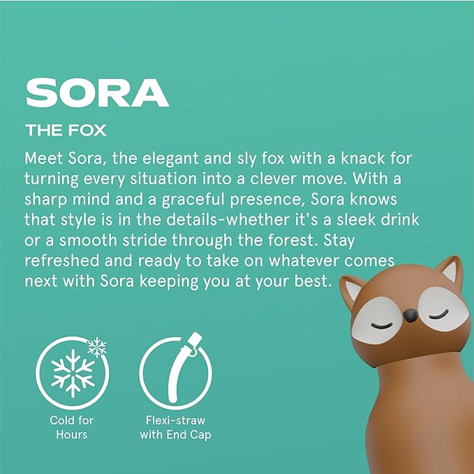 asobu Bestie Bottle Insulated Stainless Steel Water Bottle with Detachable Soft Animal Head Fun Drinking For Kids and Teens with Flexible Reusable Straw 16 Ounce (Fox)