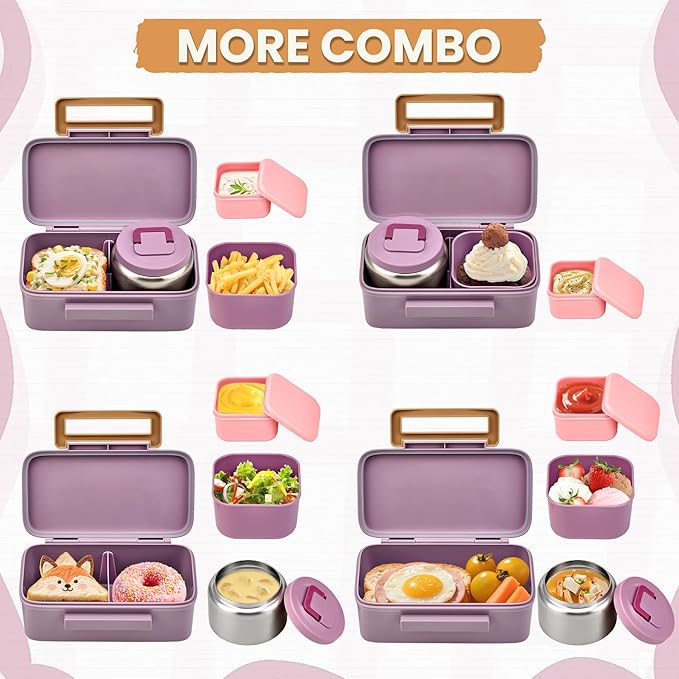 - Bento Box & Thermo for Hot Lunches: The bento lunch box features tight-sealing lids and divided compartments to prevent mixing. The included thermos jar keeps soups, pasta, or rice warm for hours, making it ideal for hot lunches at school. Leakproof containers prevent mess in backpacks, offering a worry-free lunch solution for parents.