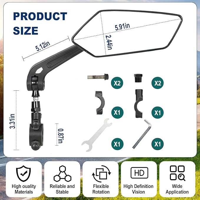 - 【UNIVERSAL FIT】The Bike Mirror Is Designed To Fit Different Sizes Of Handlebars, Which Conforms To An External Diameter Of 20-25mm For Many Types Of Bikes, Such As Mountain Bikes, e-Bikes, Road Bikes And City Bikes