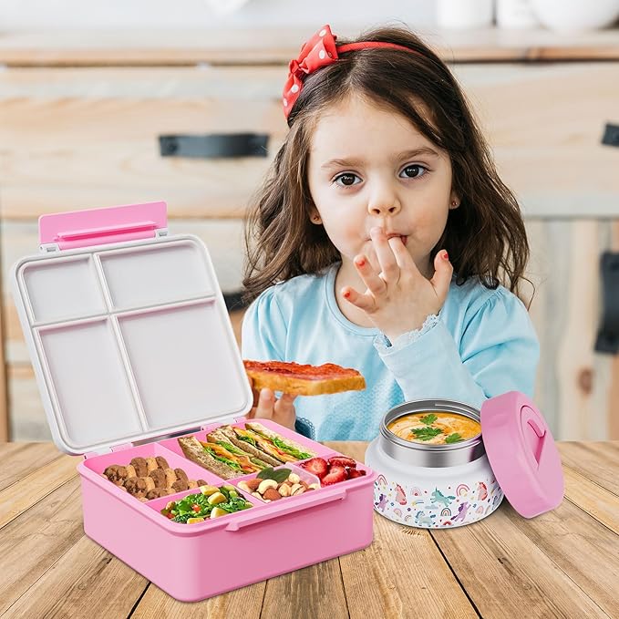 - All-in-One Bento Lunch Box Set:Our lunchbox set includes a 4-compartment lunch box, 9oz kids thermo food container, utensils and insulated lunch bag. Perfect for school, office or picnic. BPA free and leak proof design.