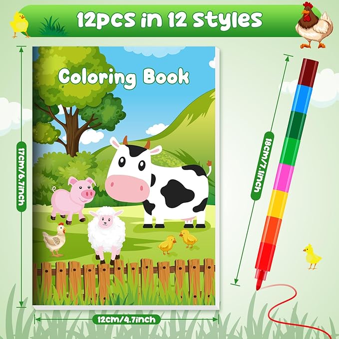 - Package Include: you will get 12 pieces of farm animals coloring books bulk and 12 pieces of stacking crayons.The quantity is enough to meet your DIY needs, kids will be very excited to see mini coloring books, color it right away, let your kids play all day long
