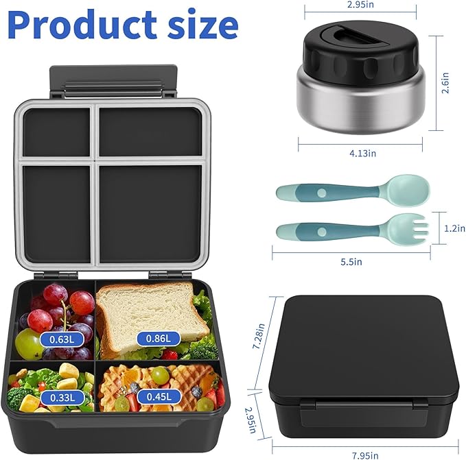- All-in-One Bento Lunch Box Set:Our lunchbox set includes a 4-compartment lunch box, 9oz kids thermo food container, utensils and insulated lunch bag. Perfect for school, office or picnic. BPA free and leak proof design.