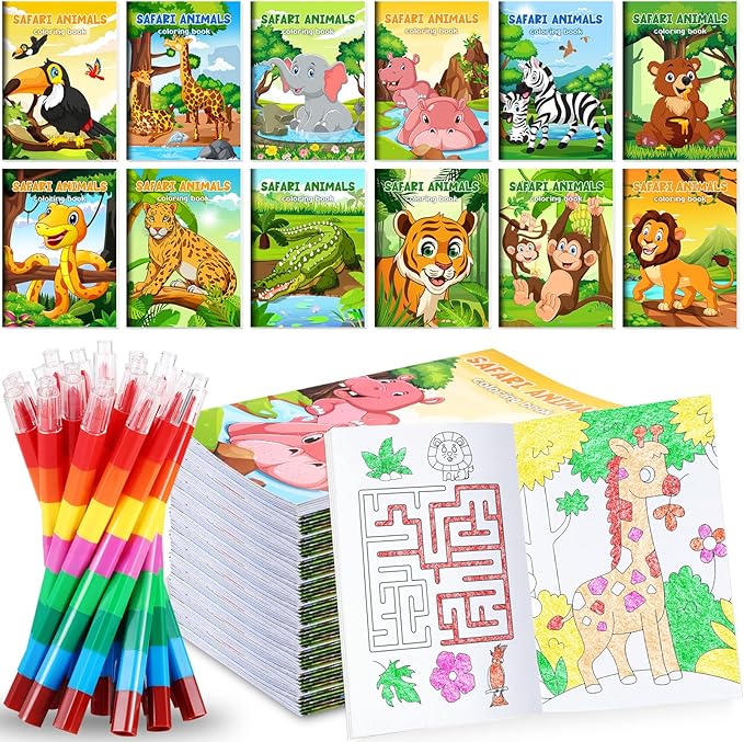 - Package Include: you will get 12 pieces of jungle safari animals coloring books bulk and 12 pieces of stacking crayons.The quantity is enough to meet your DIY needs, kids will be very excited to see mini coloring books, color it right away, let your kids play all day long
