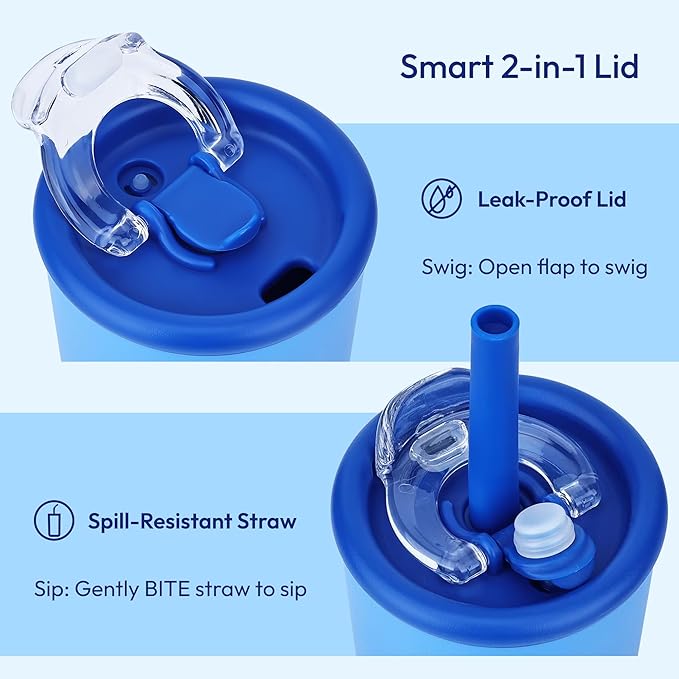 - Smart Sipping, No Spills: Our clever spill-resistant silicone straw tip lets you sip easily with a gentle nibble, creating a secure seal when released, while the 2-in-1 lid also allows you to drink directly by flipping the flap
