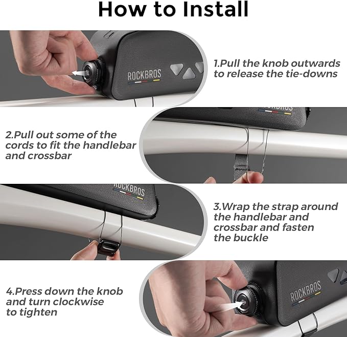 - Easy to Install: The ROCKBROS top tube bag adopts a self-developed innovative installation method, equipped with a sturdy and enduring knob and high-strength binding rope. Simply pull to release, wrap around, and press to tighten for quick, secure and firm fixing without looseness.