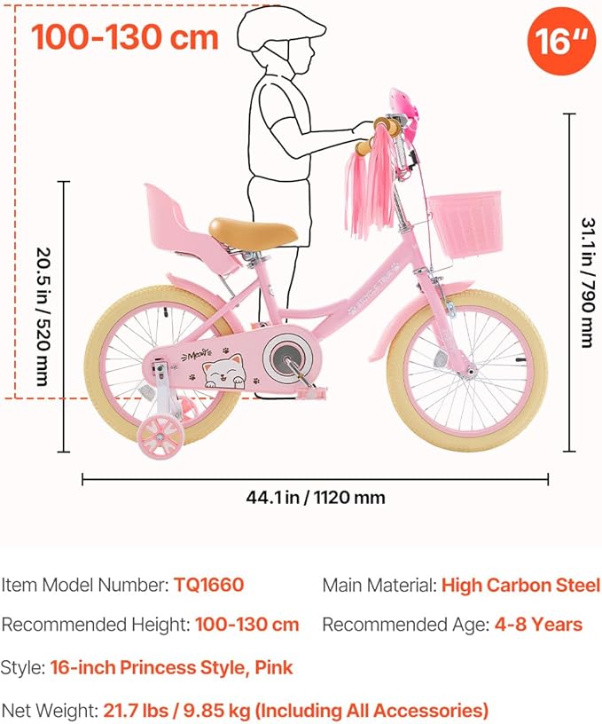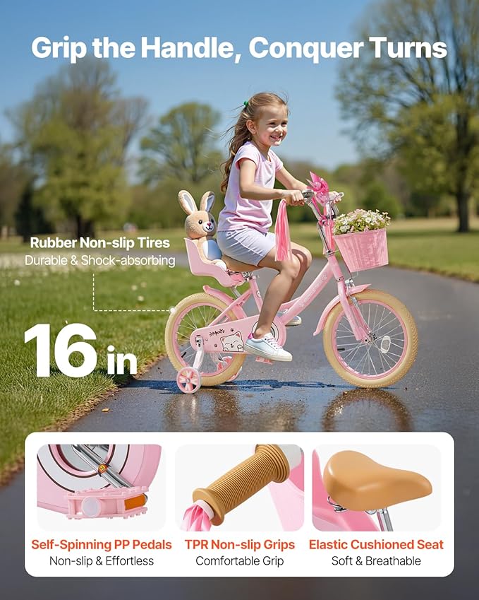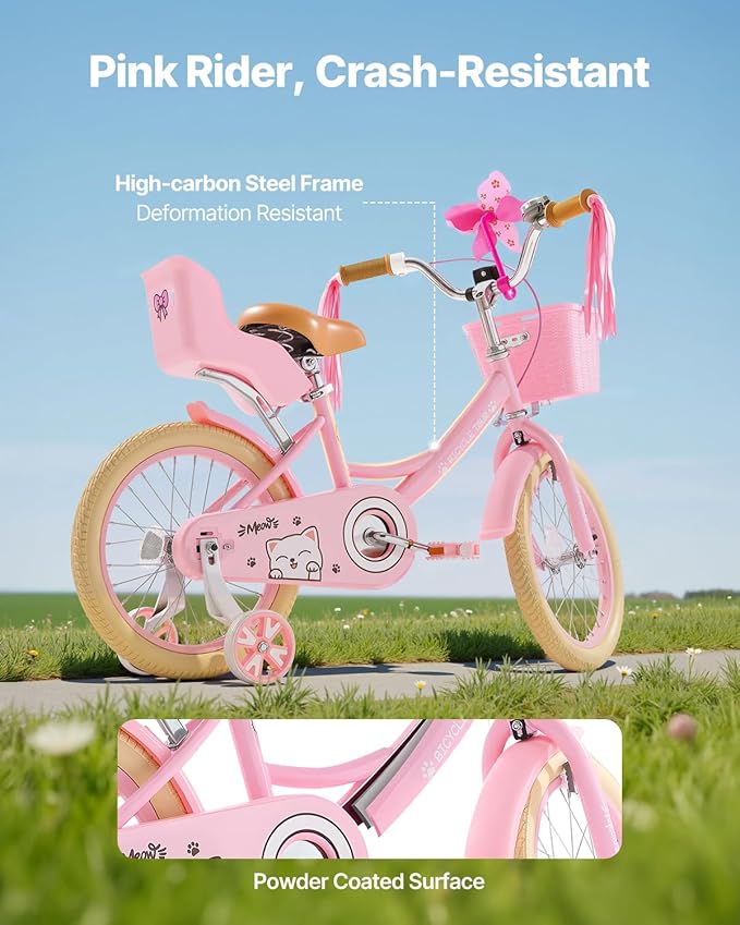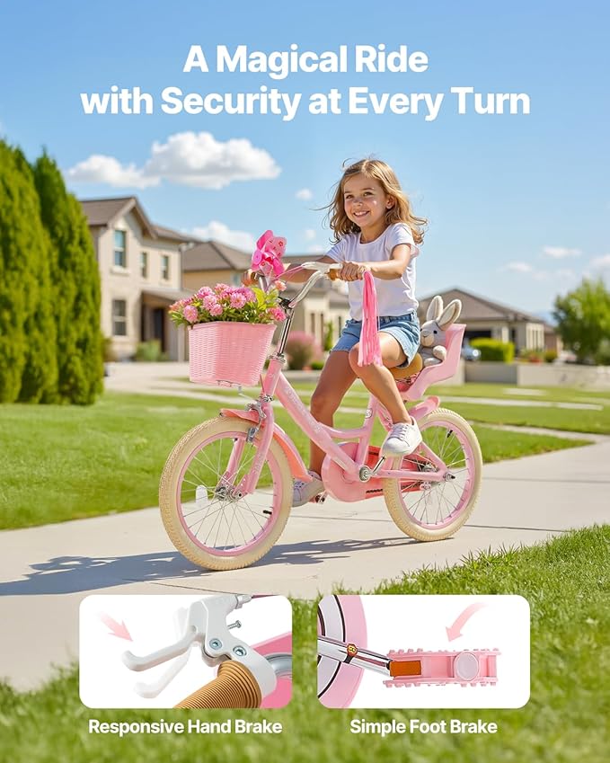- 【Princess Style Design:】The children bicycle is built with a 1.0 mm thick high-carbon steel frame, using argon welding and powder coating. High strength, corrosion-resistant, and impact-resistant—ready for any adventure!