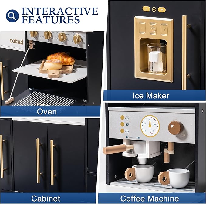- LUXURIOUS DESIGN, REFINED TASTE: The ROBUD Black & Gold Kids Kitchen Set combines modern elegance with exquisite craftsmanship. Featuring a realistic ice maker, faucet, coffee machine, and oven, it delivers an immersive play experience with a premium touch.