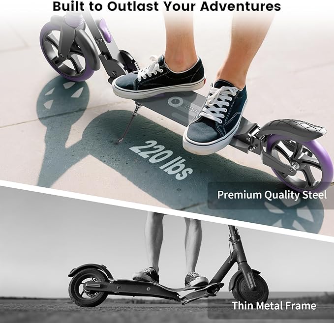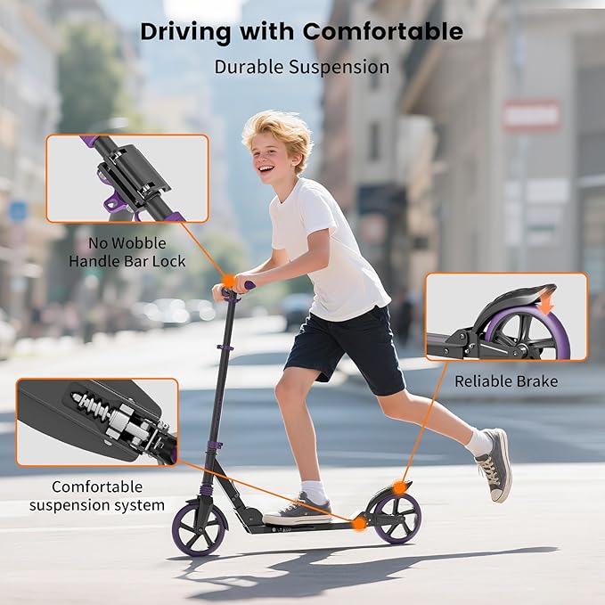 - Safety is Our Top Priority: The handle double-layer lock prevents the handle from falling, Extra-wide Non-slip DECK(Max load Riders 240 LBS), and the high-quality heat-treated brakes, provide you with security. The rear suspension absorbs 60% of impacts, resulting in a smoother and more comfortable ride